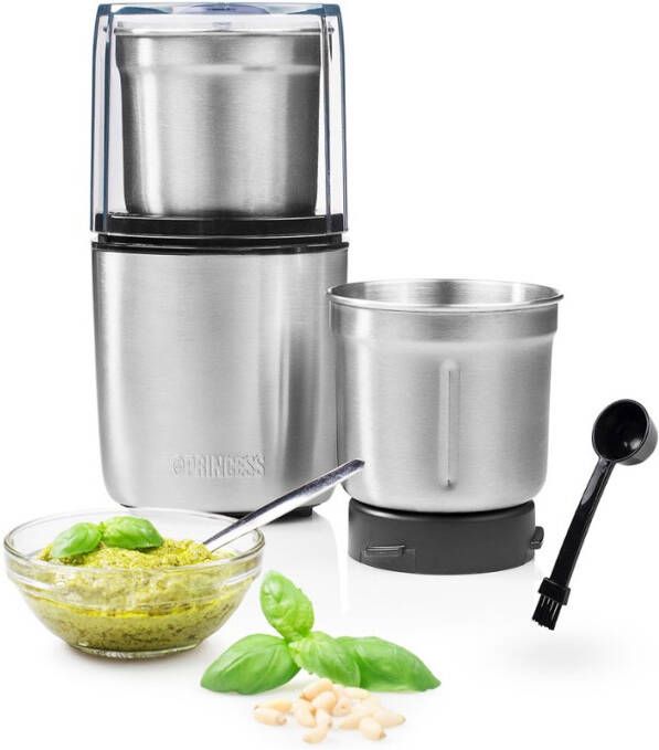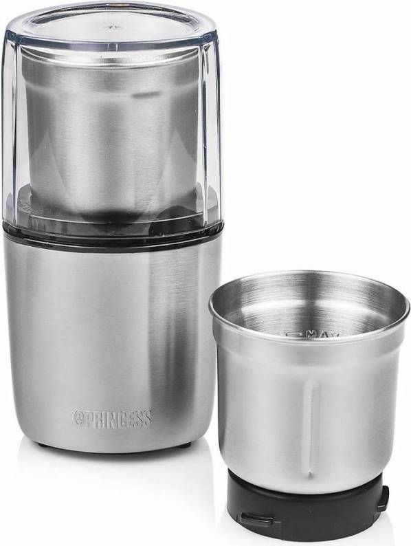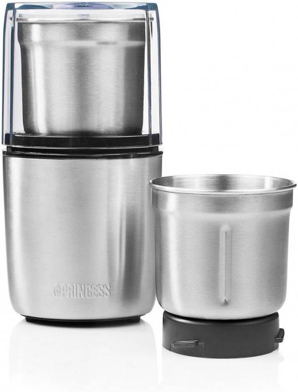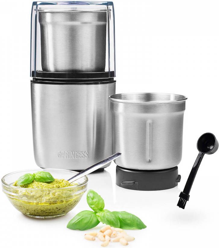 Voor de meeste mensen is het fijnhakken van voedsel geen favoriete bezigheid- Maak je leven iets makkelijker met de Princess 221040 Multi Hakmolen voor vochtige en droge producten- De twee handige afneembaar bekers hebben speciale messen voor bijvoorbeeld het malen van koffiebonen of het maken van pesto- De veilige drukbediening maakt de hakmolen heel handig in gebruik- Twee afneembare bekers Bij de Princess Multi Hakmolen ontvang je twee bekers met verschillende messen- De maalbeker heeft twee messen en maalt koffiebonen en specerijen tot fijn poeder voor heerlijke verse koffie of geurige specerijenmengsel- De hakbeker heeft vier messen die groenten en verse kruiden grof of fijn snijden naar gelang je de hakmolen laat draaien- Maak zo je eigen verse pesto binnen enkele seconden- Handige drukbediening Het transparante deksel zorgt voor een veilig gebruik en is heel handig te bedienen- Je plaatst het deksel over de gekozen beker op de basis en door het deksel ingedrukt te houden, activeer je de hakmolen- Geen geknoei en geen mogelijkheid om bij de messen te komen- Zodra je het deksel loslaat, stopt de molen en kan je de deksel veilig verwijderen- Makkelijk schoon te maken De Princess Multi Hakmolen heeft een handige lepel met borsteluiteinde zodat je veilig de ingrediënten uit de beker kan scheppen- Met het borsteltje kan je restjes makkelijk uit de bekers verwijderen- De twee roestvrijstalen beker zijn geschikt voor de vaatwasser waardoor het schoonmaken zeer snel en makkelijk is- Wat vind je in de doos: Princess Multi Hakmolen, een roestvrijstalen maalbeker, een roestvrijstalen hakbeker, lepel met borstel, handleiding Redenen om voor de Princess Multi Hakmolen te kiezen: * Twee verschillende bekers voor het hakken van groenten en kruiden en het malen van koffiebonen en specerijen * Maak binnen enkele seconden pesto, gemalen koffie of snipper een ui fijn * Veilige drukbediening met transparant deksel voor hakken zonder geknoei * Makkelijk schoon te maken dankzij de vaatwasbestendige onderdelen en inclusief lepelborstel * Krachtig 200 Watt vermogen waardoor de hakmolen ook geschikt is voor noten en koffiebonen.